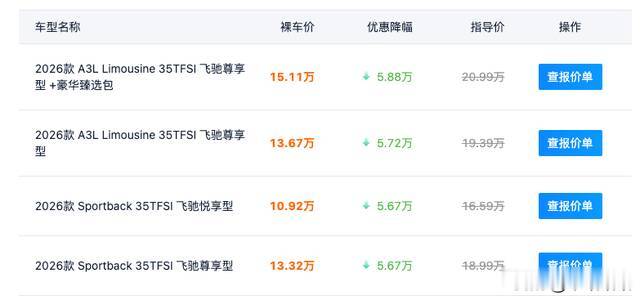 奥迪就更不用说了。A6L优惠15.1万降到27.69万,A7L直降18.72万,《飞驰人生》里的原型车奥迪A3在一些门店直接报价10万出头。10万啊,这价格都快赶上二手车市场了。