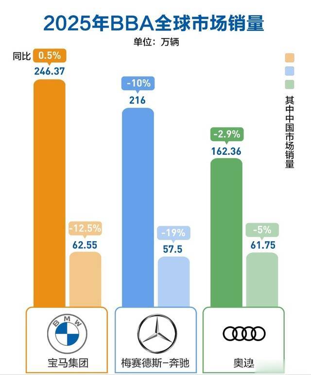数据更残酷。2025年BBA在华销量集体“滑铁卢”:奔驰同比暴跌19%,宝马下滑12.5%,三家总销量退回到七年前的水平。